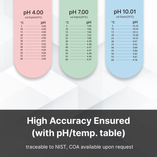 Each solution is standardized against NIST-certified pH references with an accuracy of ±0.01 pH at 25 °C (77 °F), making the kit ideal for the calibration of all types of pH meters, from laboratory to field applications.Because pH values are temperature-dependent, a temperature/pH reference chart is conveniently printed on each bottle label to support accurate calibration under different conditions.