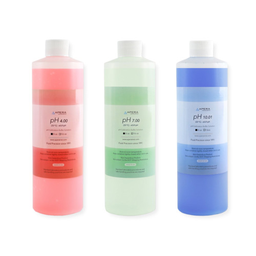 The Apera Instruments AI1115 pH Calibration Buffer Solution Kit includes three 8 oz (240 mL) bottles of color-coded pH buffer solutions: pH 4.00, pH 7.00, and pH 10.01.